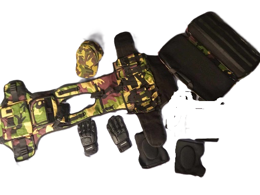 1- Chaleco Táctico Camo, 1- Bolsa Marcadora Camo, 1- Guantes con Dedos , 1 -Rodilleras , 1- Gorra Camo. * *Oferta de gastos de envió solo válido para península.